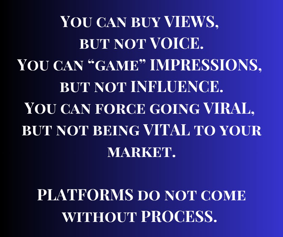 Creating a voice that they (your market) can’t unhear, the voice they PREFER, the voice that they trust… the voice they come looking for when the “algorithm” stops showing you to them or the CSM doesn’t deliver your email. That is built OVER TIME and in INTIMATE capacities (at first.) This is NEVER built with robots or automated this or that. Not ever.